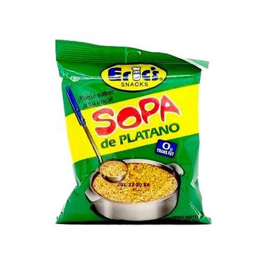 Erics Sopa de Platano" es una sopa de plátano elaborada por la marca Erics, conocida por sus mezclas de sopas secas. Esta sopa en particular es libre de gluten y lácteos, y se vende como una mezcla seca. La sopa de plátano es un plato tradicional en algunas culturas latinoamericanas, donde se prepara con plátanos verdes o maduros, y a menudo se le agrega carne, verduras y especias.