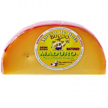 El queso de bola Buono maduro, también conocido como queso Edam, es un queso semiduro de leche de vaca originario de los Países Bajos, específicamente de la ciudad de Edam. Se caracteriza por su cubierta de cera roja o amarilla, que protege su interior suave y ligeramente salado. El queso Edam se somete a un proceso de maduración, lo que le da un sabor que mejora con el tiempo.