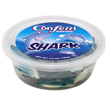 Los Confetti Sharks (o Confeti Tiburón) son una especie de caramelo con forma de tiburón que contiene confeti de colores. Los ingredientes principales suelen incluir azúcares, jarabe de maíz, jarabe de glicerina, y saborizantes. También pueden contener colorantes alimentarios para el confeti.