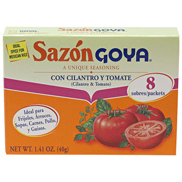 El Sazón Goya de Cilantro y Tomate es una mezcla especial de especias y condimentos que hacen de cada platillo una exquisitez. Le da a cada plato ese sabor latino que tanto nos encanta. El Sazón Goya viene con Culantro y Achiote, con Azafrán, sabor a Jamón, Cilantro y Tomate, y sin Achiote.