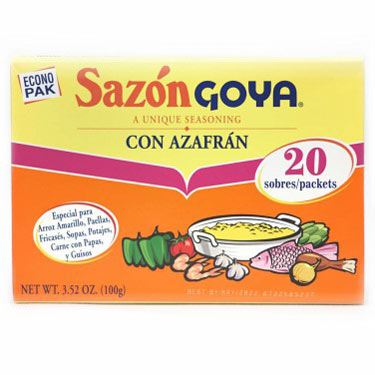 El Sazón Goya con Azafrán es una mezcla especial de especias y condimentos que hacen de cada platillo una exquisitez. El Sazón le da a cada plato ese sabor latino que tanto nos encanta. El Sazón Goya viene con Culantro y Achiote, con Azafrán, sabor a Jamón, Cilantro y Tomate, y sin Achiote..