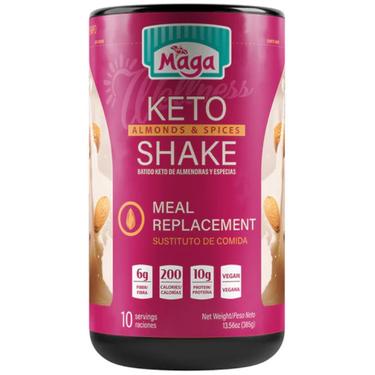 El "Maga Keto Shake Almond and Spices" es una bebida a base de proteína diseñada para personas que siguen una dieta cetogénica. Está elaborada con ingredientes que son bajos en carbohidratos y ricos en grasas saludables, como almendras y especias. Una porción contiene 10 gramos de proteína, 0mg de colesterol, 10mg de sodio, 135mg de calcio, 1.8mg de hierro y 320mg de potasio.