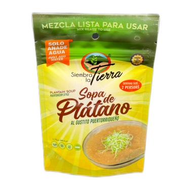 "Siembra la Tierra" es una marca puertorriqueña de productos naturales, y su "Sopa de Plátano" es una mezcla seca lista para preparar, sin gluten, vegana, y sin OMG ni MSG. La mezcla solo requiere agregar agua y sal al gusto para hacer una sopa de plátano puertorriqueña.