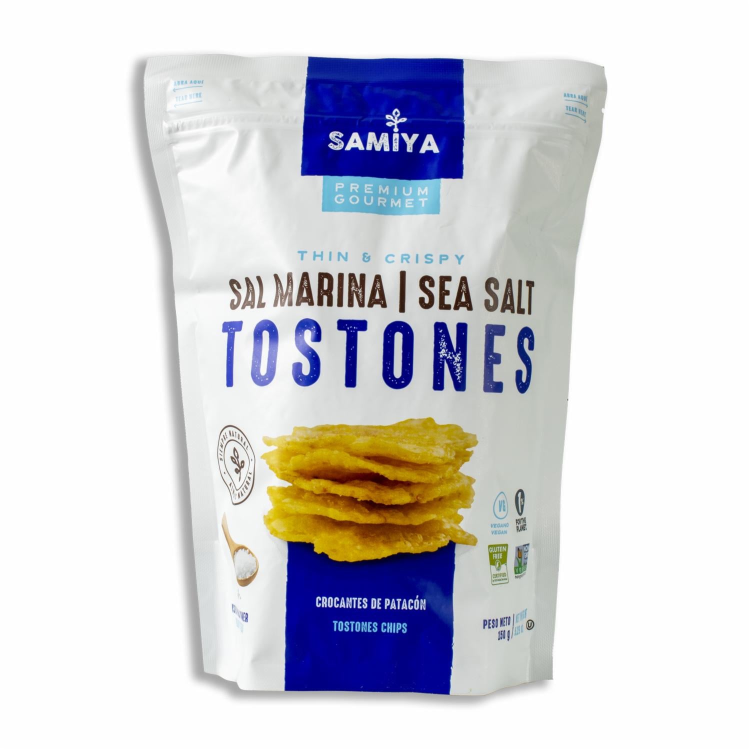 Los tostones Samiya son chips de plátano verde fritos, listos para comer y con sabor a sal marina. Son un producto de la marca Samiya que se describe como crujiente, natural y delicioso. Se comercializan en paquetes de 150g y se presentan como una alternativa a los tostones caseros, ofreciendo una opción conveniente para disfrutar de este snack popular