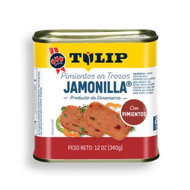 La Jamonilla Tulip con pimiento es un producto cárnico enlatado, probablemente de cerdo, que se ofrece en pedazos de carne junto con pimientos, ideal para preparar platos como guisos, estofados, croquetas o incluso agregarlo a ensaladas o pastas.