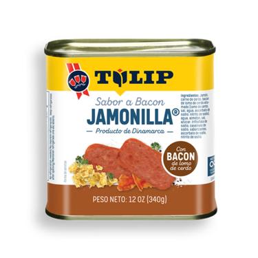 La Tulip Jamonilla con Bacon es un producto cárnico enlatado de la marca Tulip, con sabor a bacon. Se trata de una forma conveniente y rápida de disfrutar de un plato con sabor ahumado y salado, perfecta para sándwiches, guisos o como acompañamiento.